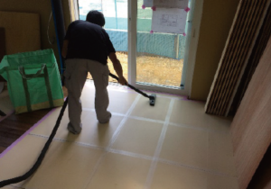 石ころ一つ噛み込まないよう、養生の前には徹底的に掃除機をかけます。