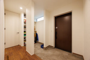 扉をつけて来客時の目隠しにしたり、通り抜けできるウォークスルータイプにして